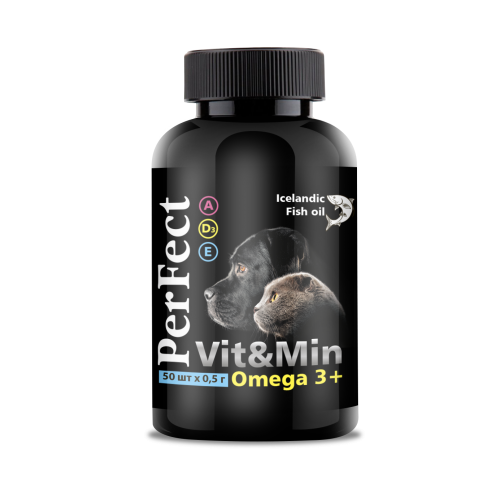 Препарат Perfect VIT&MIN Omega 3+ містить Омега-3 поліненасичені жирні кислоти (ПНЖК) та антиоксиданти, що сприяють нормалізації ліпідного обміну, розрідженню крові, мають кардіопротекторну дію, сприяють підтримці мозкової діяльності, когнітивних функцій, підтримують шкіру здоровою і покращують стан шерсті. Препарат допомагає прискорити процес линьки, стимулює ріст і розвиток тварин. Регулярне застосування ПНЖК сприяє поліпшенню засвоюваності і підвищенню активності інших вітамінів: вітаміну А (ретинолу), вітамінів групи В, вітаміну D і вітаміну Е (токоферолу). Омега-3 жирні кислоти, такі як DHA (докозагексаєнова кислота) і EPA (ейкозапентаєнова кислота), містяться у великих кількостях у риб’ячому жирі.