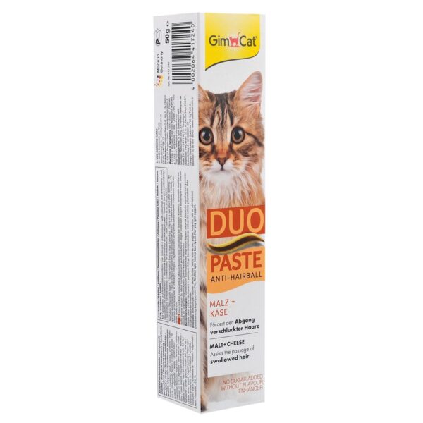 GimCat Anti-Hairball Duo-Paste – це паста, яка дозволяє виводити шерсть зі шлунка тварини природним шляхом коштом інгредієнтів, що в неї входять. Паста містить не тільки клітковину, нормалізує травлення, але і мальт (солод), що утворюється на стадії ферментації зерен ячменю, який сприяє просуванню вовни, що потрапила в шлунок, по кишківнику і подальшого її виведенню природним шляхом. Регулярне застосування пасти сприяє нормалізації травлення, покращує апетит тварини.