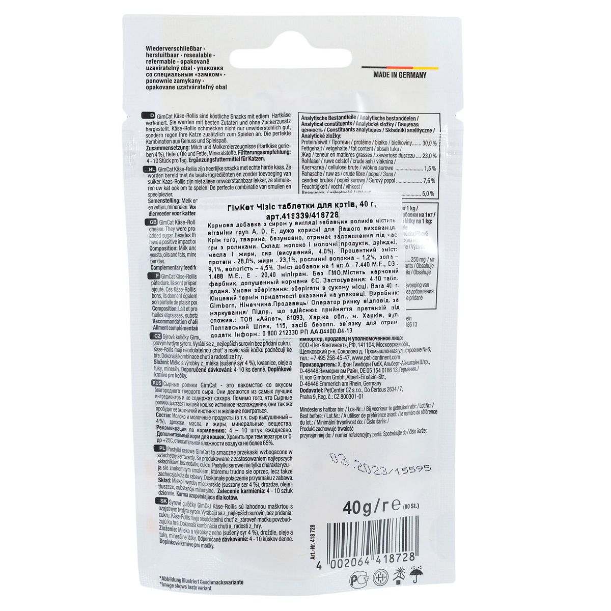 Ласощі GimCat для котів, Kase-rollis сирні ролики, 80 таб/40 г
