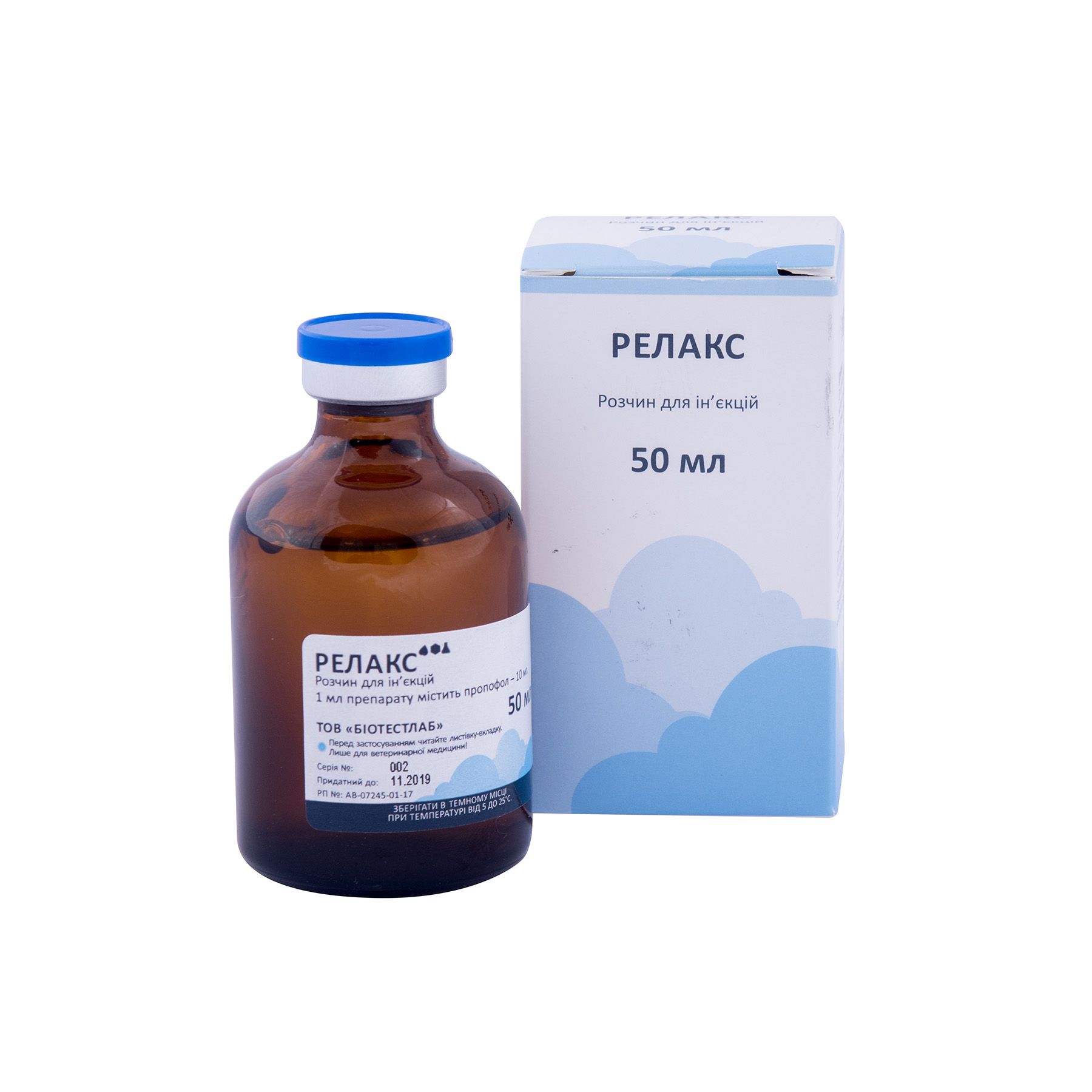 Релакс належить до групи препаратів для неінгаляційного наркозу, седативний засіб ультракороткої дії. Пропофол – діюча речовина препарату Релакс характеризується високою ліпофільністю та легко проникає через гематоенцефалічний бар’єр, викликає швидкий короткочасний анестезуючий ефект з мінімальними проявами стадії збудження. Протягом 30-60 секунд настає медикаментозний сон, розвиток якого обумовлений неспецифічним впливом пропофолу на іонні канальці мембран нейронів центральної нервової системи. Анестезуюча дія після одноразового введення препарату в рекомендованій дозі становить до 8 хв. При підтримці анестезії в звичайному режимі значної кумуляції препарату не спостерігається. Після внутрішньовенного введення пропофол зв’язується з білками плазми (98%), метаболізується, головним чином, у печінці шляхом кон’югації з утворенням неактивних метаболітів, які виводяться з організму тварин, в основному, з сечею (близько 88%).