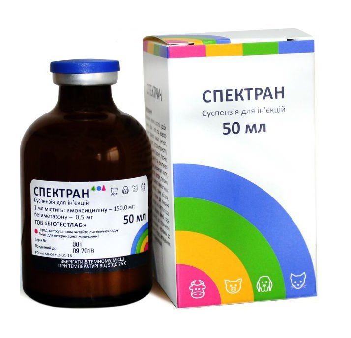 Спектран – комплексний препарат, що має виражену протимікробну та протизапальну дію. Діючими речовинами Спектрану є антибіотик амоксицилін, та кортикостероїд бетаметазон; амоксицилін – має широкий спектр протимікробної дії, бетаметазон – посилює протизапальні процеси в організмі, запобігає виникненню можливих алергічних реакцій (в тому числі на компоненти препарату).