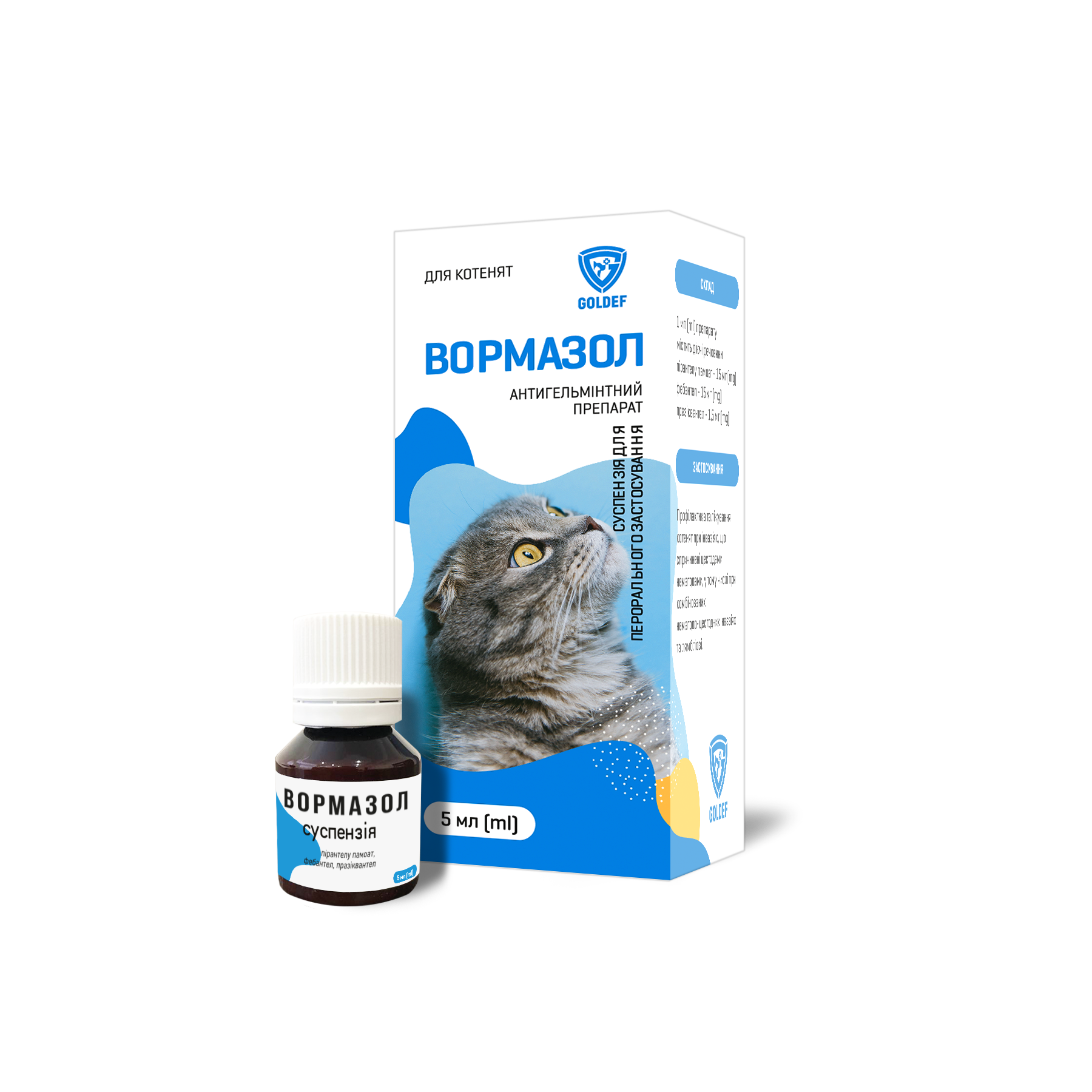 1 мл препарату Вормазол для котенят, котів і цуценят дрібних порід собак містить діючі речовини: пірантелу памоат – 15 мг (mg), фебантел – 15 мг (mg), празіквантел – 1,5 мг (mg).
